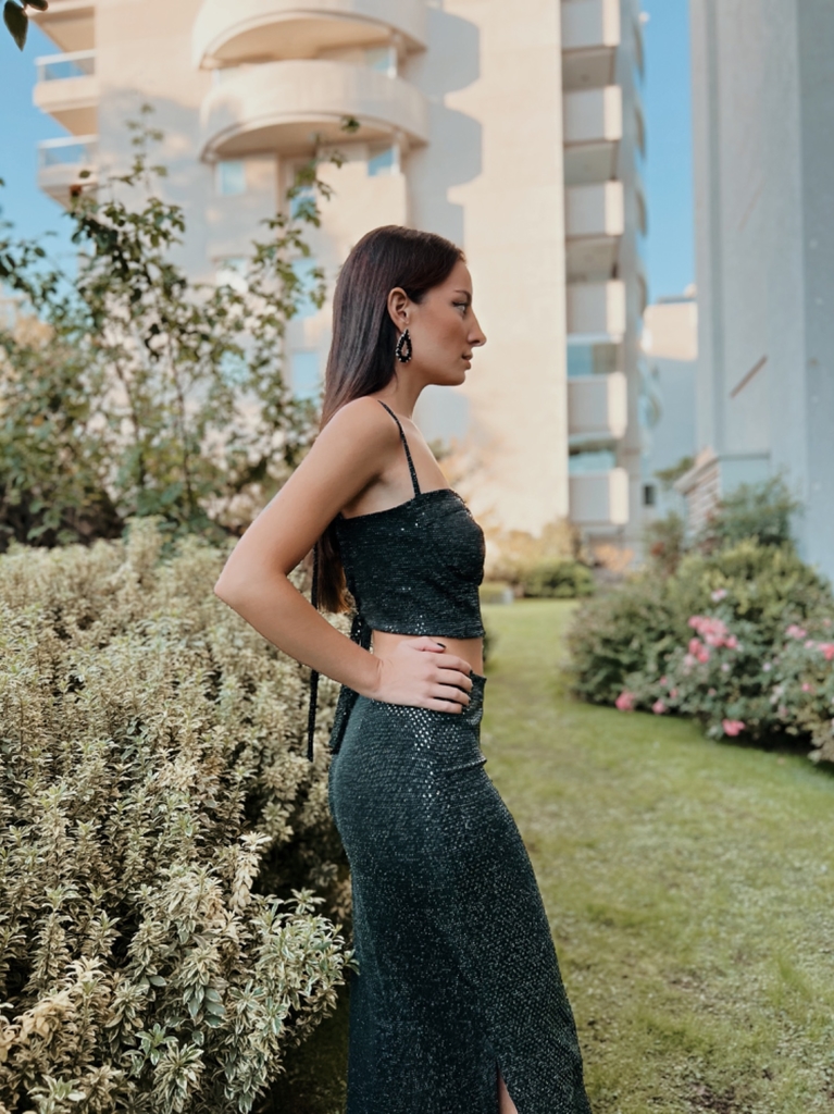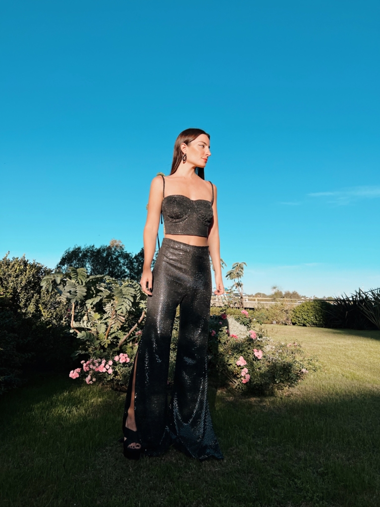 𝐃𝐄𝐓𝐀𝐋𝐋𝐄𝐒 𝐃𝐄 𝐋𝐀 𝐏𝐑𝐄𝐍𝐃𝐀: Palazo tiro alto con cierre invisible en lateral. Detalle de pinzas en espalda y tajos.