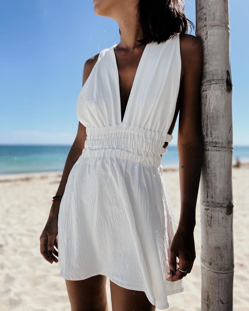 𝐃𝐄𝐓𝐀𝐋𝐋𝐄𝐒 𝐃𝐄 𝐋𝐀 𝐏𝐑𝐄𝐍𝐃𝐀: Vestido escote pronunciado en escote y espalda, con elástico en la cintura de crepe.