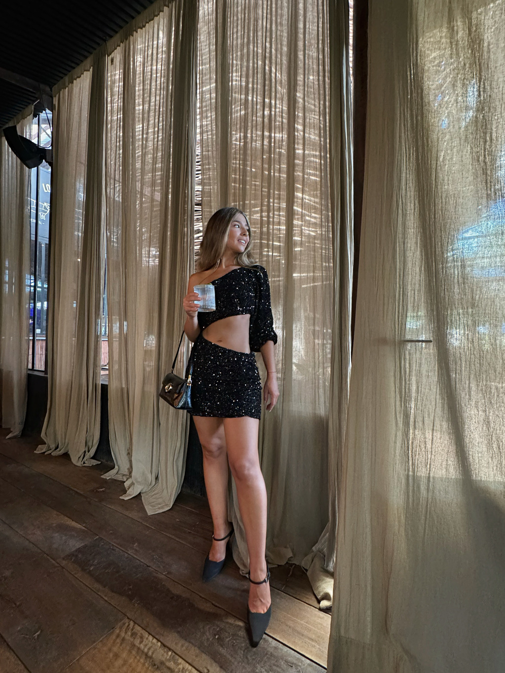 𝐃𝐄𝐓𝐀𝐋𝐋𝐄𝐒 𝐃𝐄 𝐋𝐀 𝐏𝐑𝐄𝐍𝐃𝐀: Te presentamos el Vestido Zelinne Black, un elegante y cómodo vestido con recorte en la cintura elastizado que destaca por sus sutiles brillos. Su diseño sofisticado se adapta a tu figura, brindando un ajuste perfecto que realza tus curvas. Ideal para ocasiones especiales, este vestido te permitirá brillar con estilo mientras disfrutas de la comodidad que necesitas.